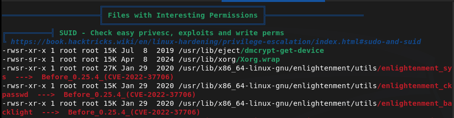 - Vulnerable SUID binary – CVE-2022-37706 (CVSS 7.8 High) – An enlightenment SUID binary was present on the system and vulnerable to a local privilege escalation exploit. SUID binaries must be audited regularly and any that are not explicitly required must have the SUID bit removed.