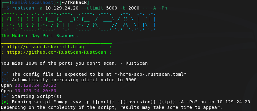 rustscan -a 10.129.24.20 –ulimit 5000 -b 2000 — -A -Pn