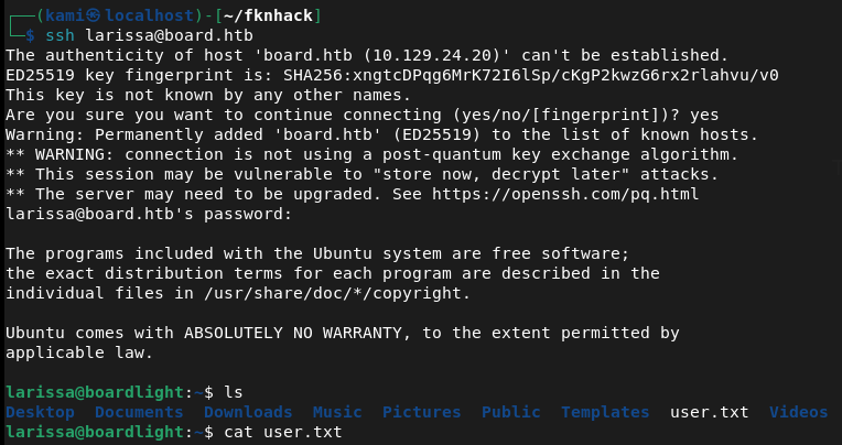 3 – Credential extraction from Dolibarr config Stabilised the shell and researched where Dolibarr stores its configuration. Found a config file containing plaintext database credentials. Tried reusing the password for the larissa user via SSH and it worked. Retrieved user.txt.