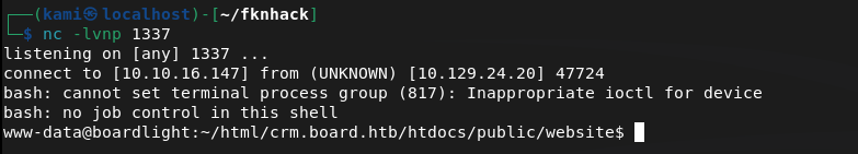 rustscan -a 10.129.24.20 –ulimit 5000 -b 2000 — -A -Pn feroxbuster -u http://10.129.24.20 -w /usr/share/seclists/Discovery/Web-Content/DirBuster-2007_directory-list-2.3-big.txt ffuf -u http://board.htb -H “Host: FUZZ.board.htb” -w /usr/share/seclists/Discovery/DNS/subdomains-top1million-110000.txt -c -fc 302 -fs 15949