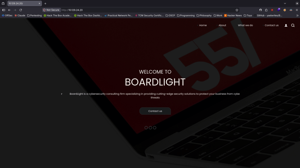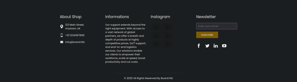 While looking around further we can see board.htb address so we can add that to /etc/hosts and also check subdomains and vhosts.