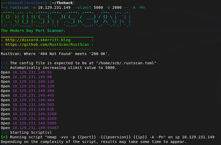 rustscan -a 10.129.231.149 –ulimit 5000 -b 2000 — -A -Pn