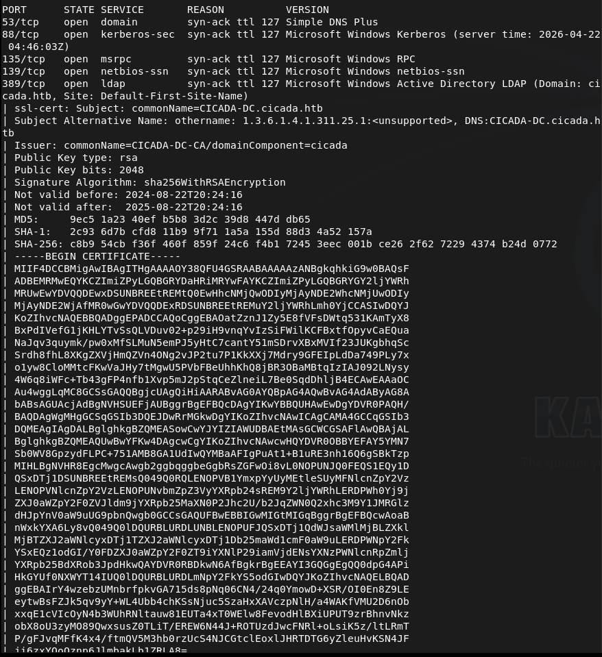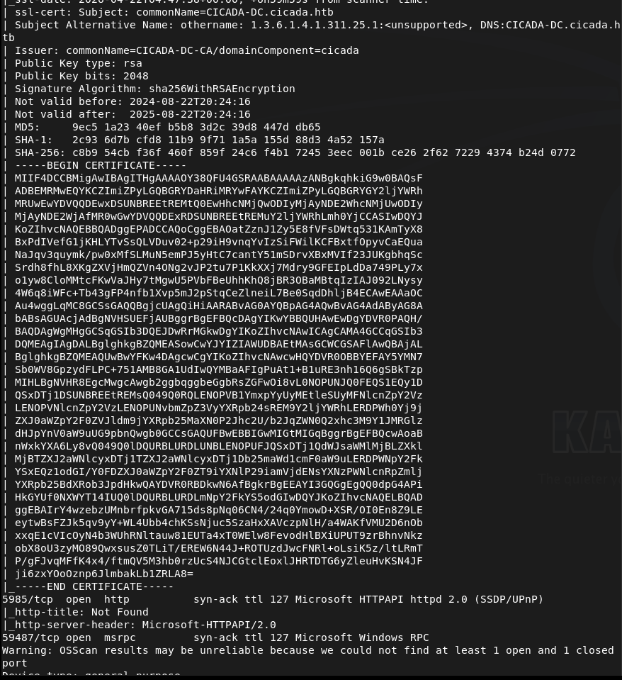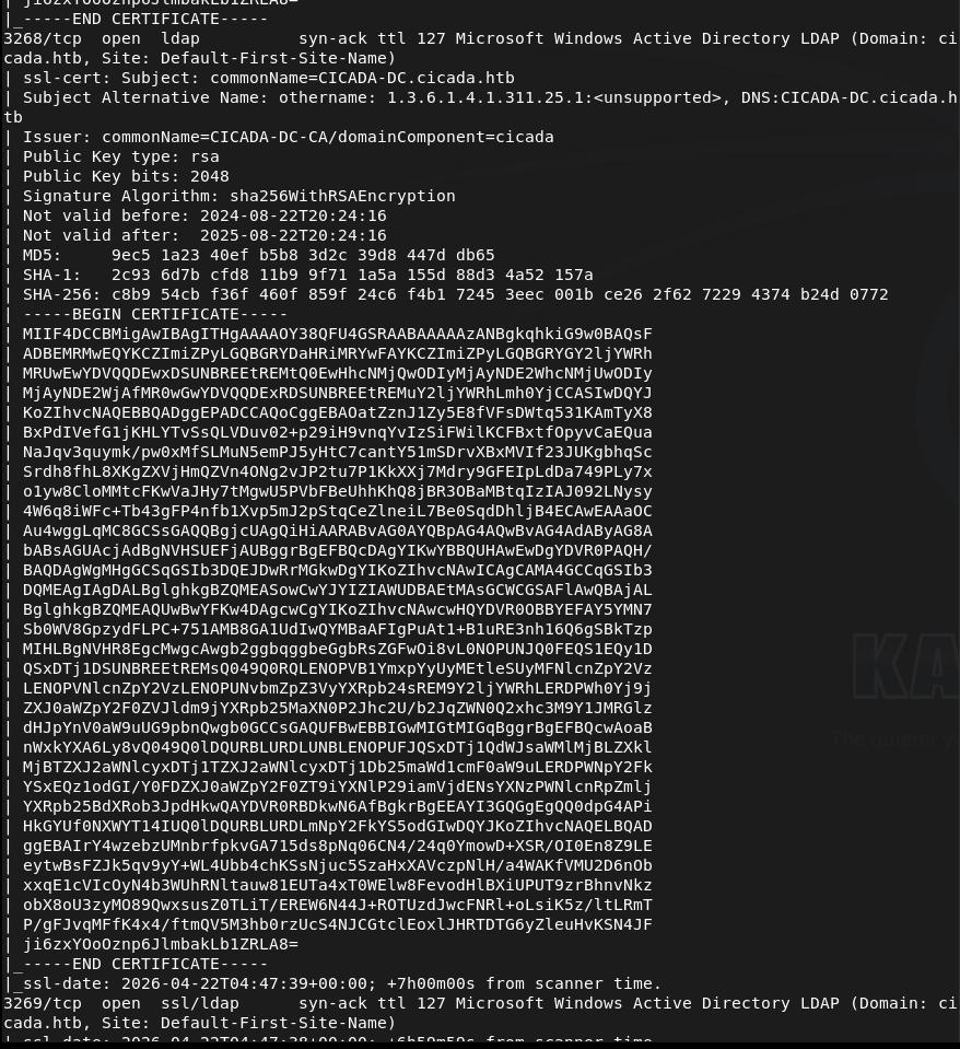 1 – Reconnaissance Ran RustScan and identified a domain-joined Windows machine with ports including 53 (DNS), 88 (Kerberos), 135 (MSRPC), 389 (LDAP), 445 (SMB), and 5985 (WinRM). Added cicada.htb to /etc/hosts. Checked the HTTP port on 5985 and got a 404.