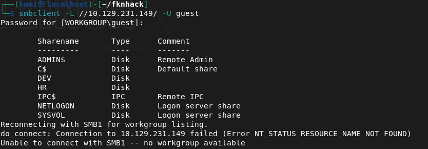 netexec smb 10.129.231.149 -u “guest” -p “” –rid-brute smbclient -L //10.129.231.149/ -U guest