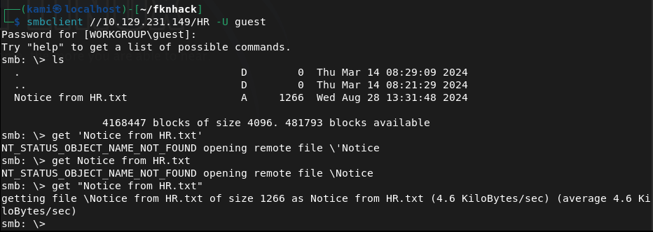 2 – SMB enumeration and default password discovery Tried unauthenticated SMB access with netexec and smbclient with no success. Used netexec RID brute-forcing with the guest account to enumerate domain users and built a user list. Reconnected to SMB as guest and found accessible shares including HR. Downloaded a file from the HR share containing a default onboarding password.