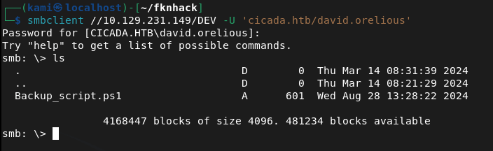 smbclient //10.129.231.149/DEV -U ‘cicada.htb/david.orelious’