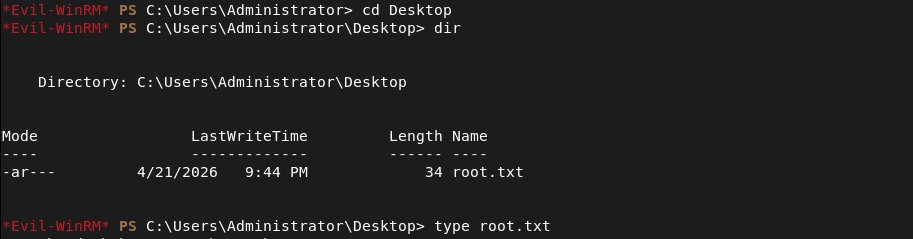 7 – Pass the hash as Administrator Cracking the Administrator hash was not successful but pass-the-hash with evil-winrm worked directly. Retrieved root.txt.