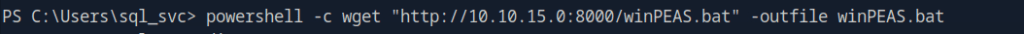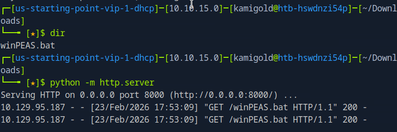 Downloaded WinPEAS. Hosted a server that I can transfer the file and downloaded it to the target machine.