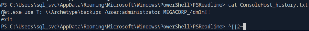 I also could’ve done manual local enumeration and other privilege escalation scripts but it wanted me to use winPEAS and unfortunately this kind of tilted me. Looking ahead there was credentials found in C:\Users\sql_svc\AppData\Roaming\Microsoft\Windows\PowerShell\PSReadline\ConsoleHost_history.txt