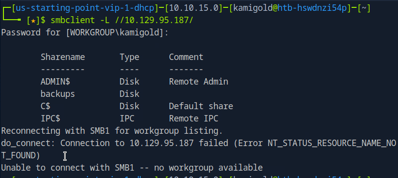 Now let’s list the SMB shares. As this is a Windows device and we have no previous credentials, lets see if we can list anything with Administrator, and we can.