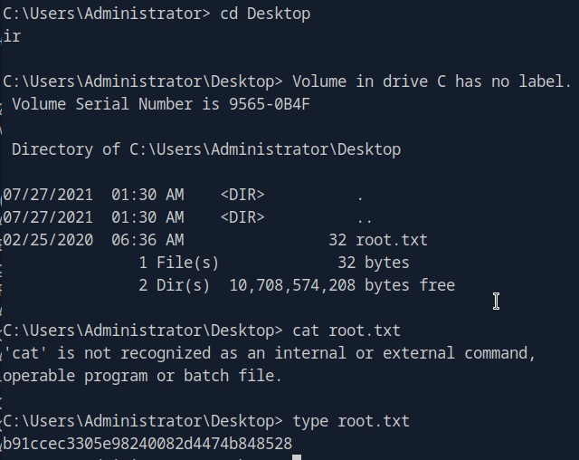 Logging in to the machine with psexec we find root.txt in the Administrator’s Desktop.